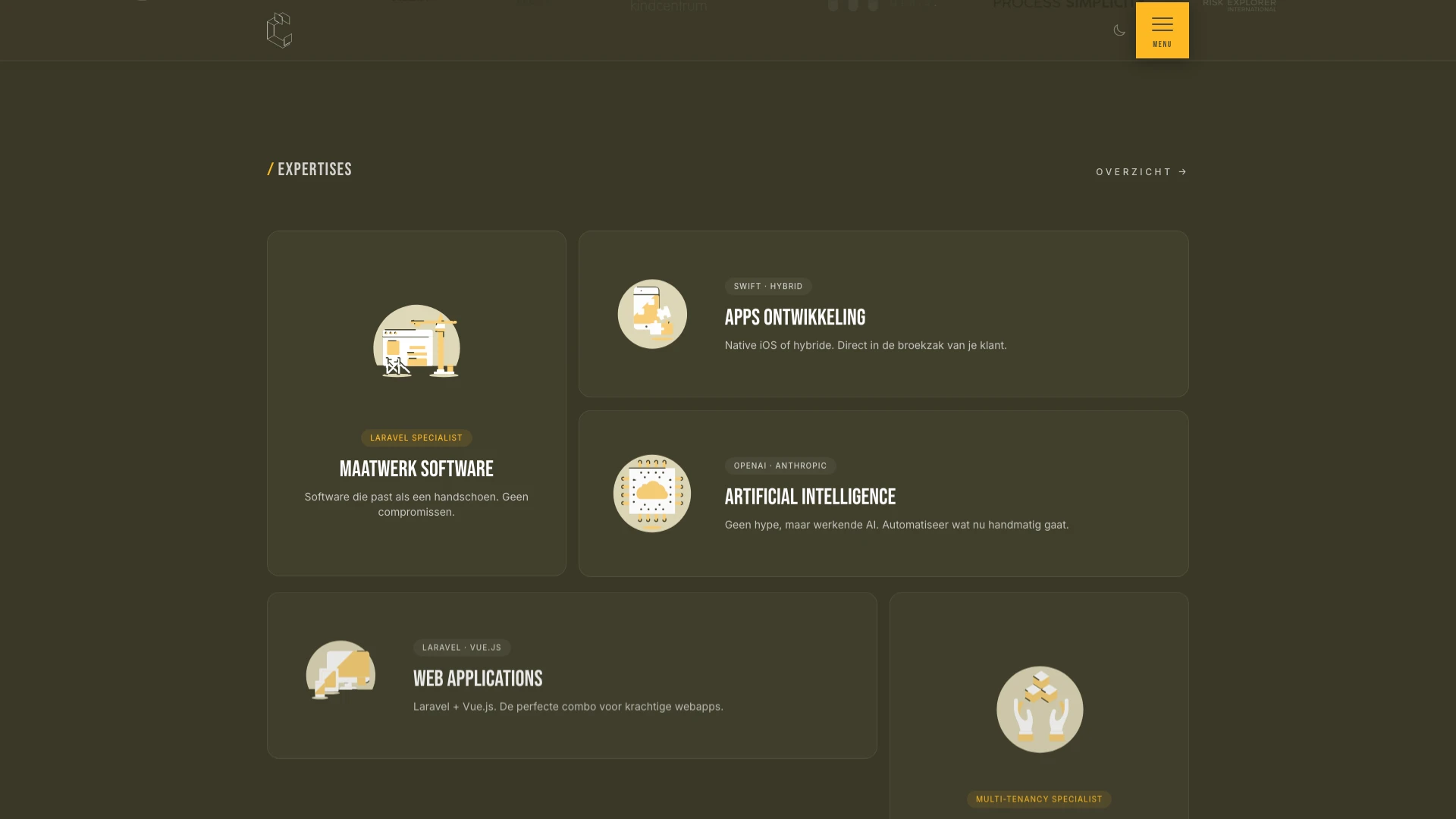 Daarom is deze site gebouwd met dezelfde stack, dezelfde kwaliteitseisen en dezelfde architectuur als onze klantprojecten. Laravel 13, Tailwind CSS v4, serverless op AWS via Vapor, met een volledig geautomatiseerde CI/CD pipeline. Geen shortcuts.
