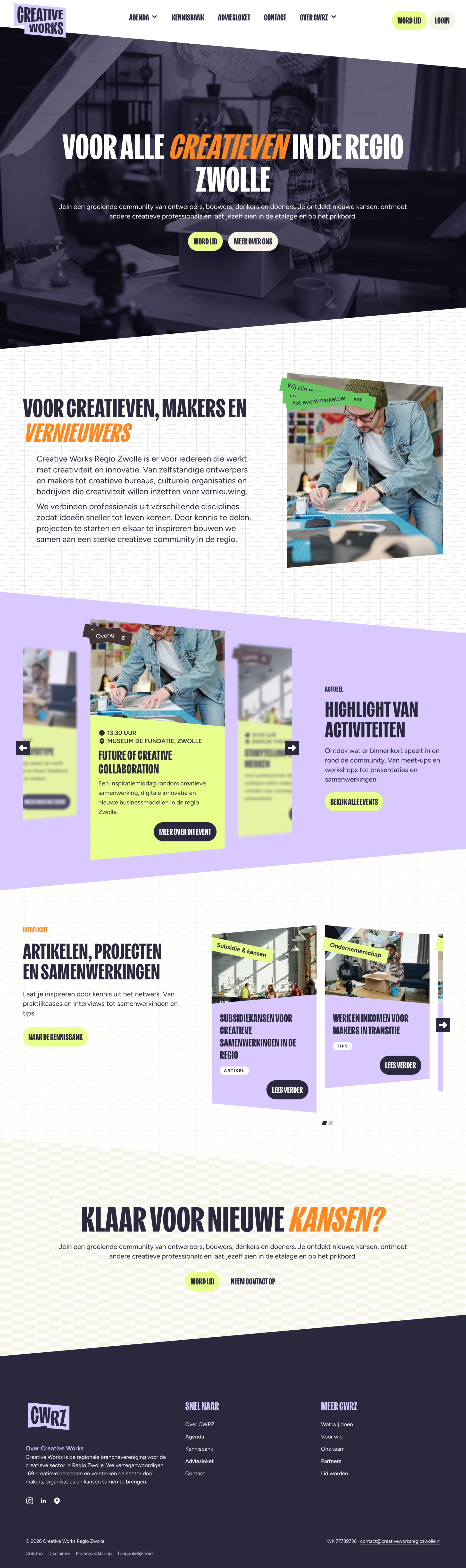 Creative Works Regio Zwolle wilde meer dan een website met nieuws en een ledenlijst. Makers moesten hun werk professioneel kunnen tonen, opdrachtgevers moesten gericht de juiste creatieve professionals vinden en de stichting moest kennisbank, events en pagina's volledig autonoom en flexibel actueel kunnen houden.
