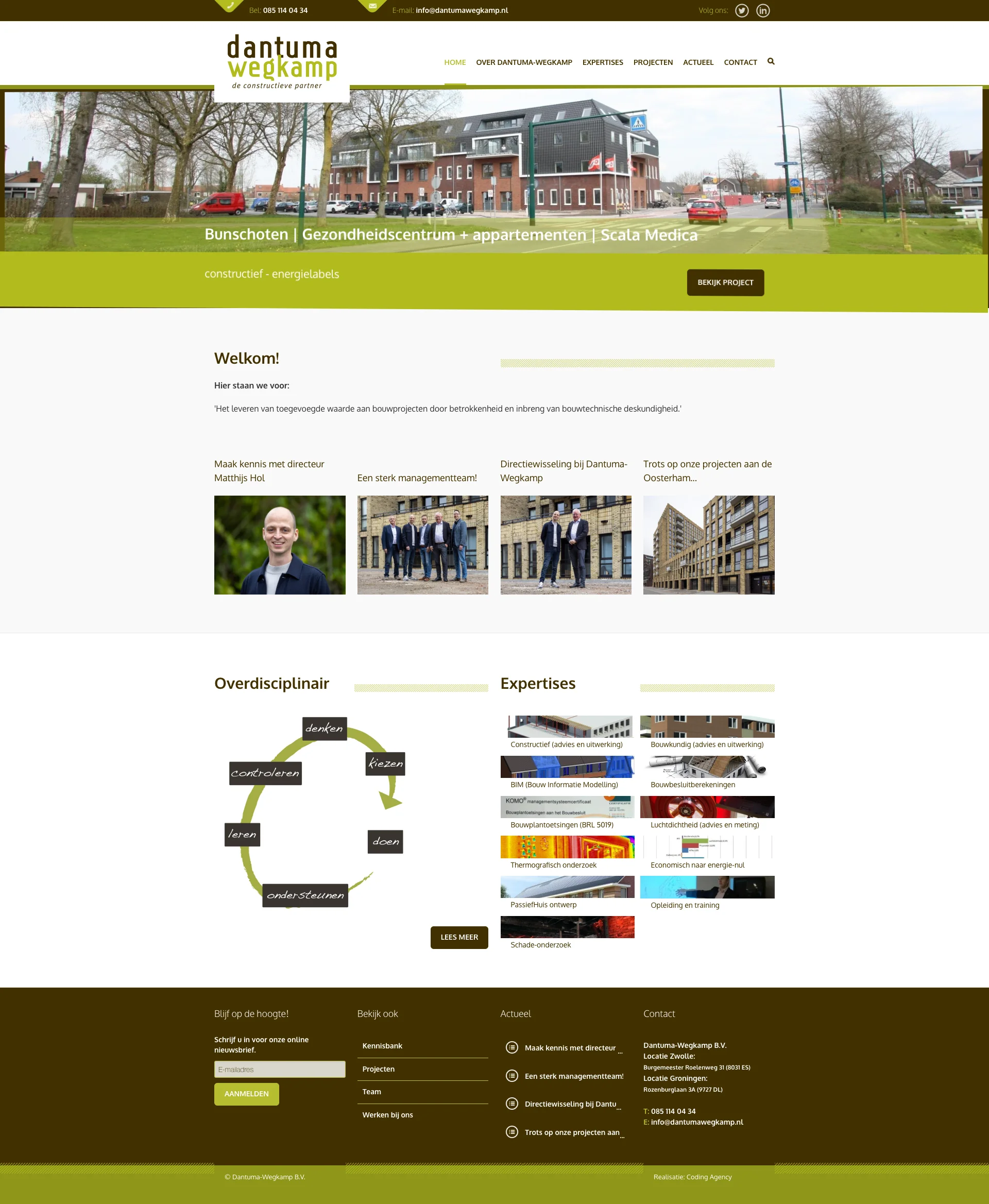 Voor Dantuma-Wegkamp moest de website meer doen dan alleen diensten opsommen. Een ingenieurs- en adviesbureau in de bouw wint vertrouwen op inhoud, ervaring en projectvoorbeelden. Die lagen moesten online helder samenkomen, zonder dat het een droge verzameling vaktermen werd.