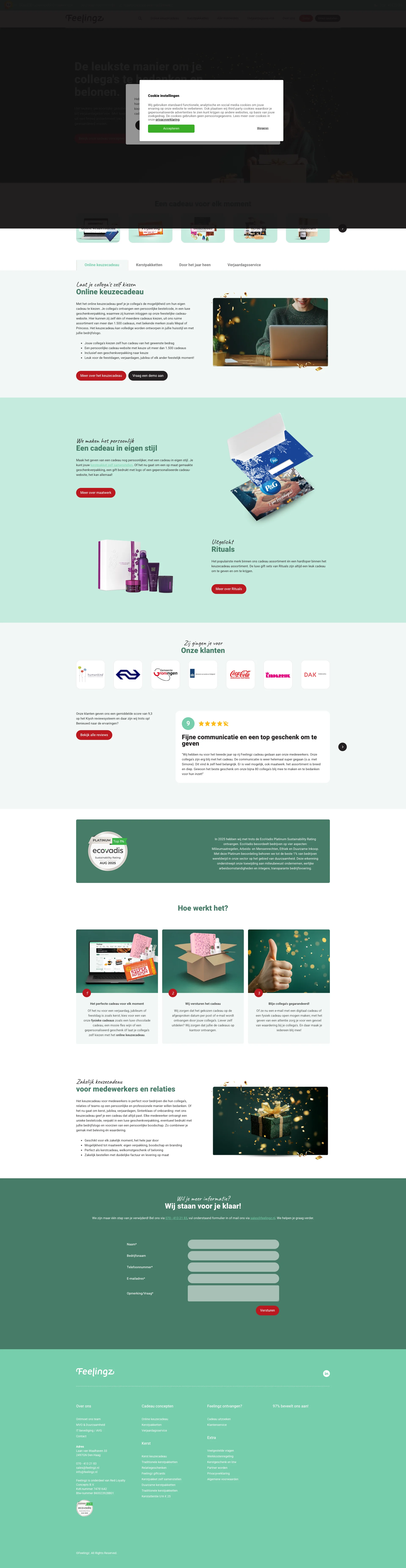 Feelingz verkoopt cadeaus, geschenkverpakkingen en relatiegeschenken. Daar zit meer logica achter dan bij een gewone webshop: productkeuze, verpakking, bezorgmethode, timing en opvolging moeten samen één kloppende bestelling vormen. Precies daar begint het verschil tussen een standaard shop en maatwerk.